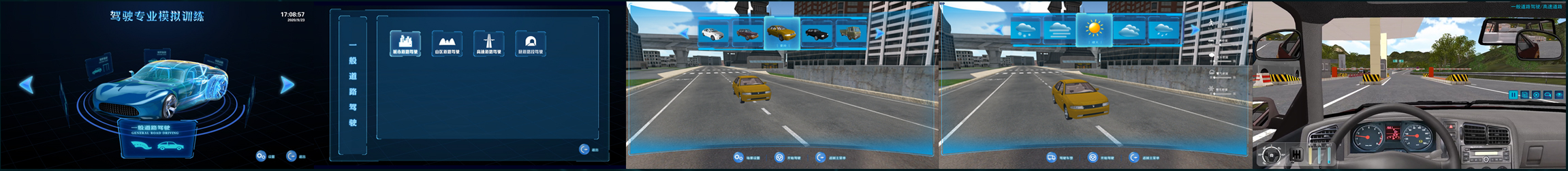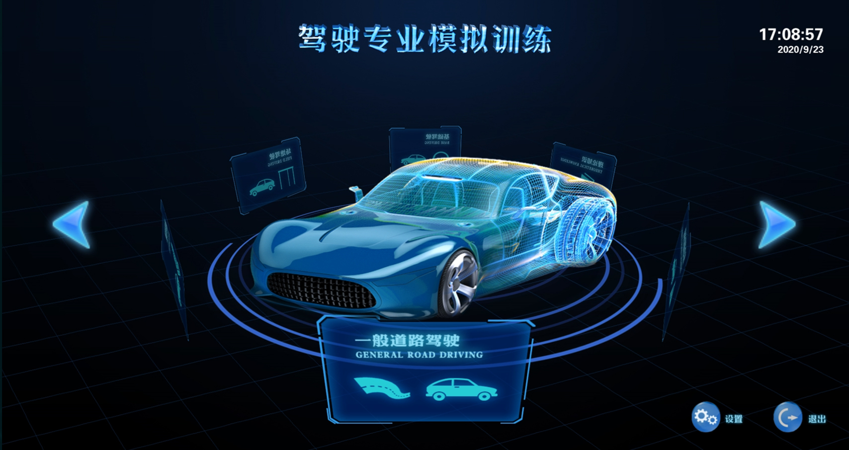 驾驶专业模拟训练系统软件分为6个模块,分别为理论知识,基础驾驶,场地驾驶,道路驾驶,一般道路驾驶,以及应急避险体验。